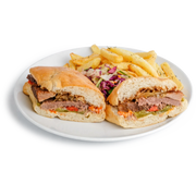 Slow-cooked cheese steak sandwich featuring roasted peppers, caramelized onions, and zesty chimichurri, served in ciabatta bread spread with mayo or BBQ sauce.