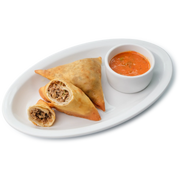 Two lightly spiced beef samosas, served with a lemon wedge.