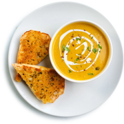 Warm yourself up with our butternut soup infused with aromatic ginger for a flavorful twist on a classic favorite. Served with warm garlic bread on the side for a deliciously comforting meal.