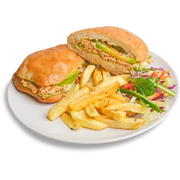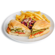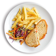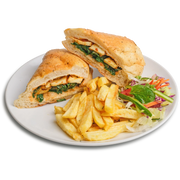 Savour the layers of fresh mozzarella, ripe tomatoes, and vibrant basil pesto, all grilled to perfection on artisanal bread. Accompanied by a refreshing garden salad and a crispy side of chips, this meal is a perfect blend of flavours and textures.