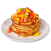 Fluffy stacks served with a drizzle of maple syrup and a dollop of butter. Order now for a timeless breakfast delight! Served with fresh fruit salad & maple syrup