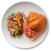 Wholegrain croissant, two eggs prepared to your liking, crispy bacon, tomatoes, cheese & served with a side of salad.