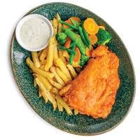 Deep fried fish fillet coated in spiced breadcrumbs with coleslaw, tartar sauce served with French fries