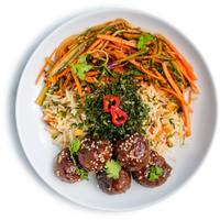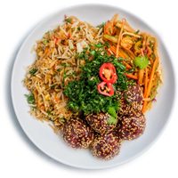 Rice noodles tossed with fresh veggies in savoury wok sauce, topped with red bullet, coriander, and spicy nuts.
