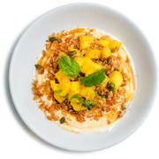 A refreshing granola bowl with fresh diced mango, mango yogurt, crunchy granola, a drizzle of honey, and a mint garnish.