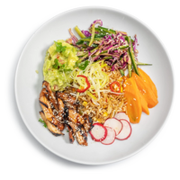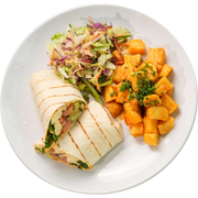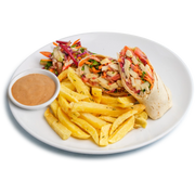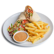 A flavourful wrap with your choice of grilled chicken in hoisin mayo, Asian garden salad, red bullet chillies, fresh coriander, pickles and a sprinkle of sesame seeds, served with fresh garden salad & seasoned fries.