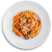 A zesty pasta dish featuring al dente penne tossed in a fiery tomato sauce infused with garlic, chilli flakes, eggplant, and fresh herbs. A tantalizing blend of heat and flavor to delight your taste buds.